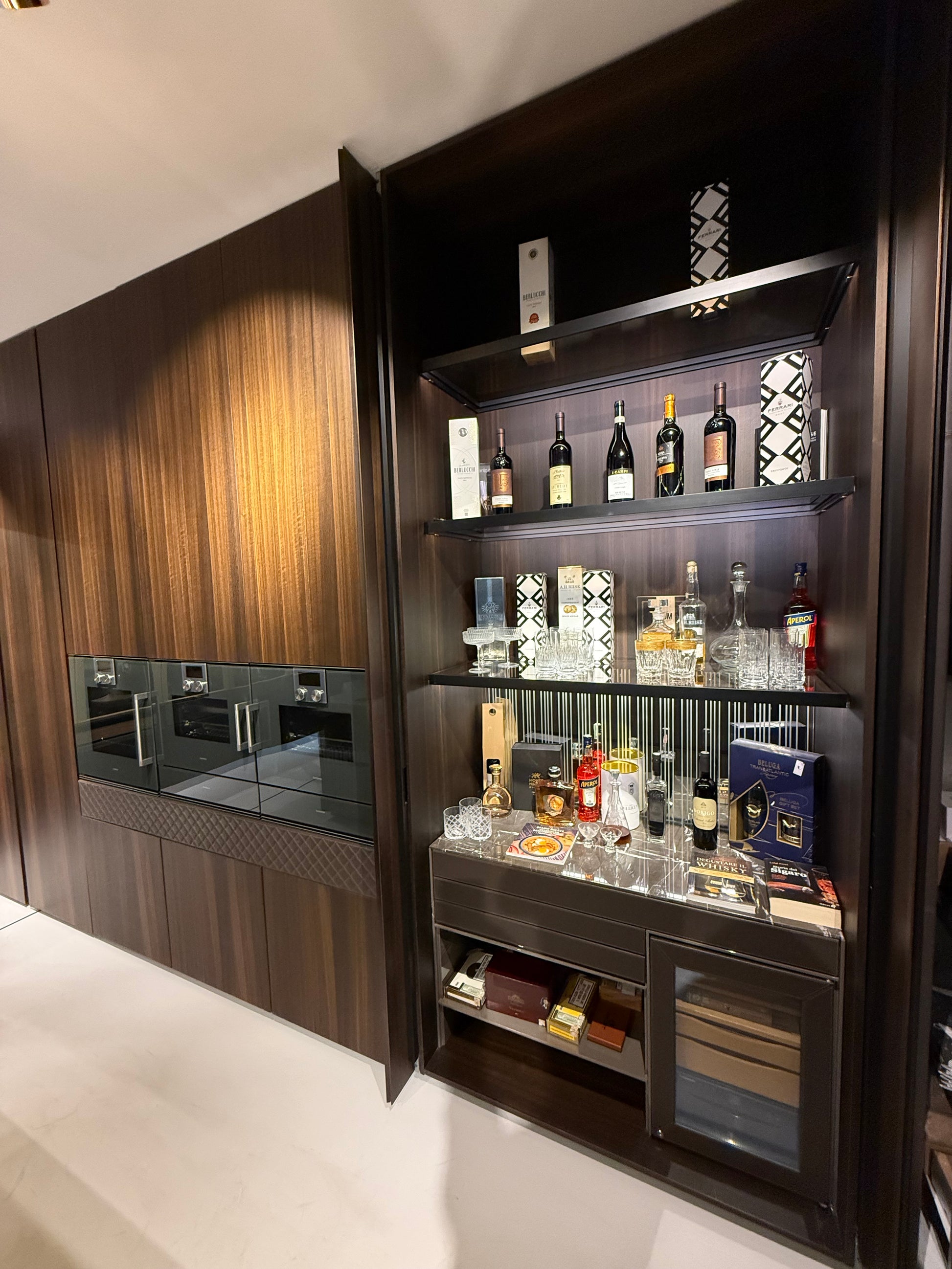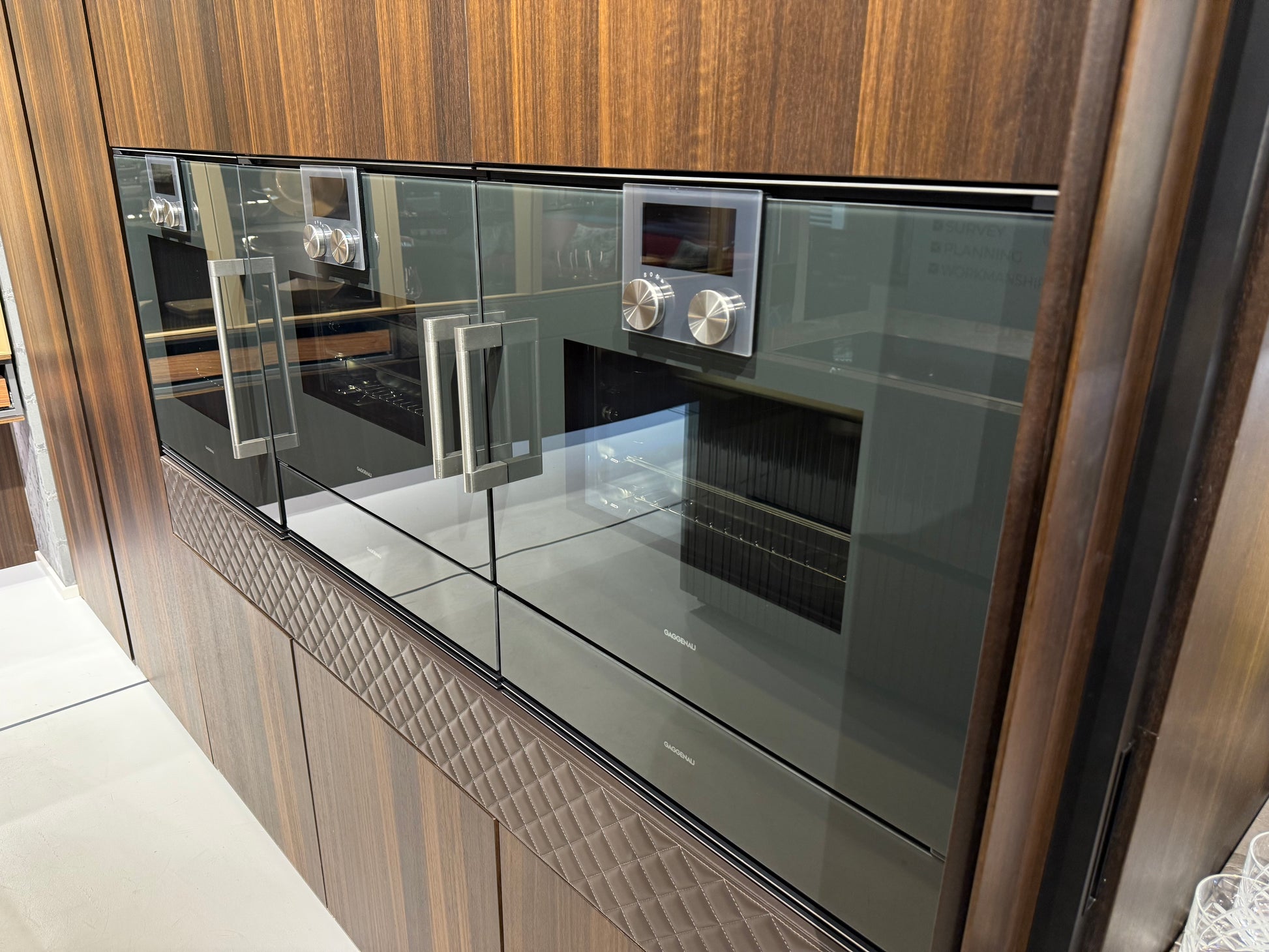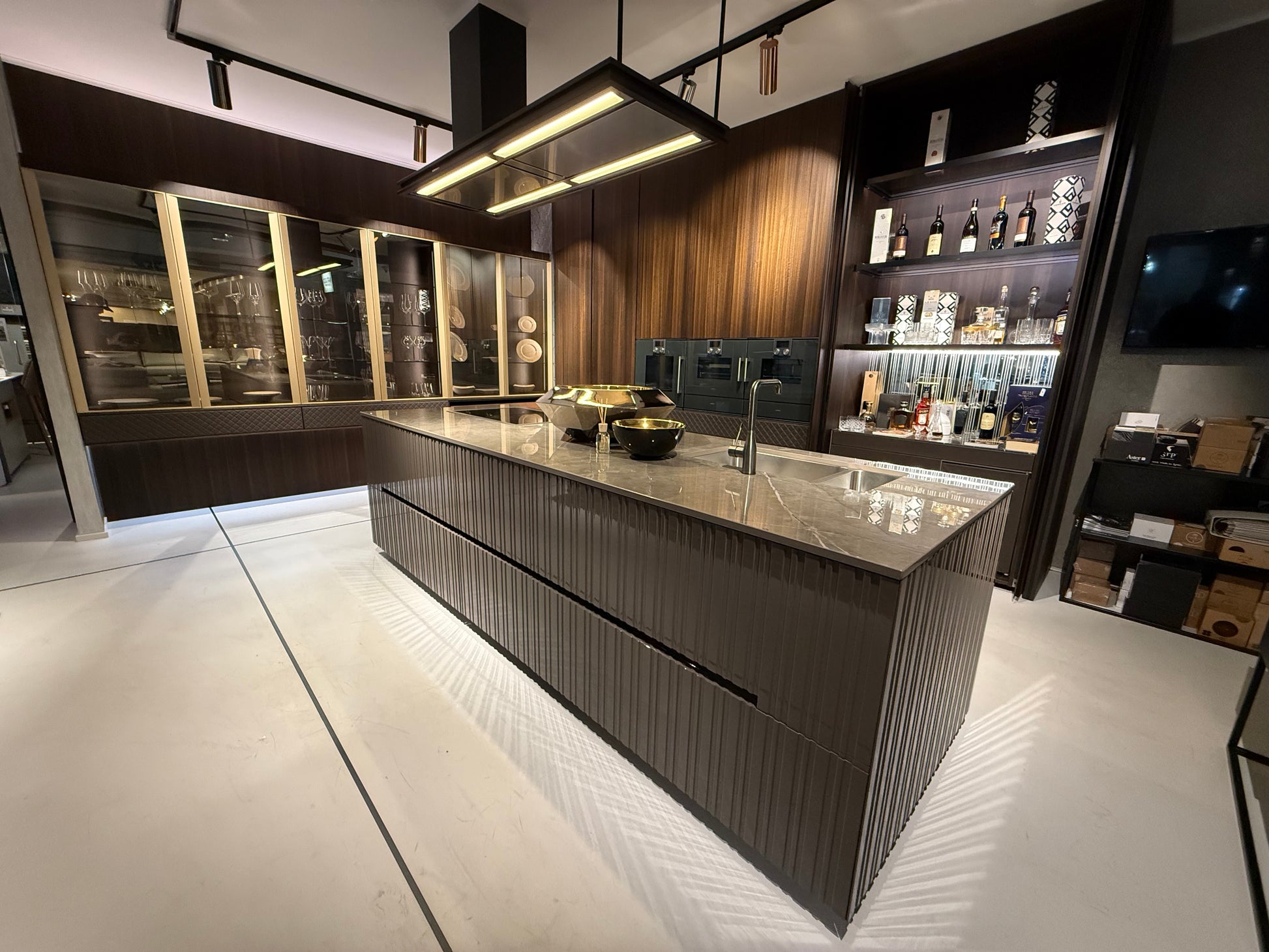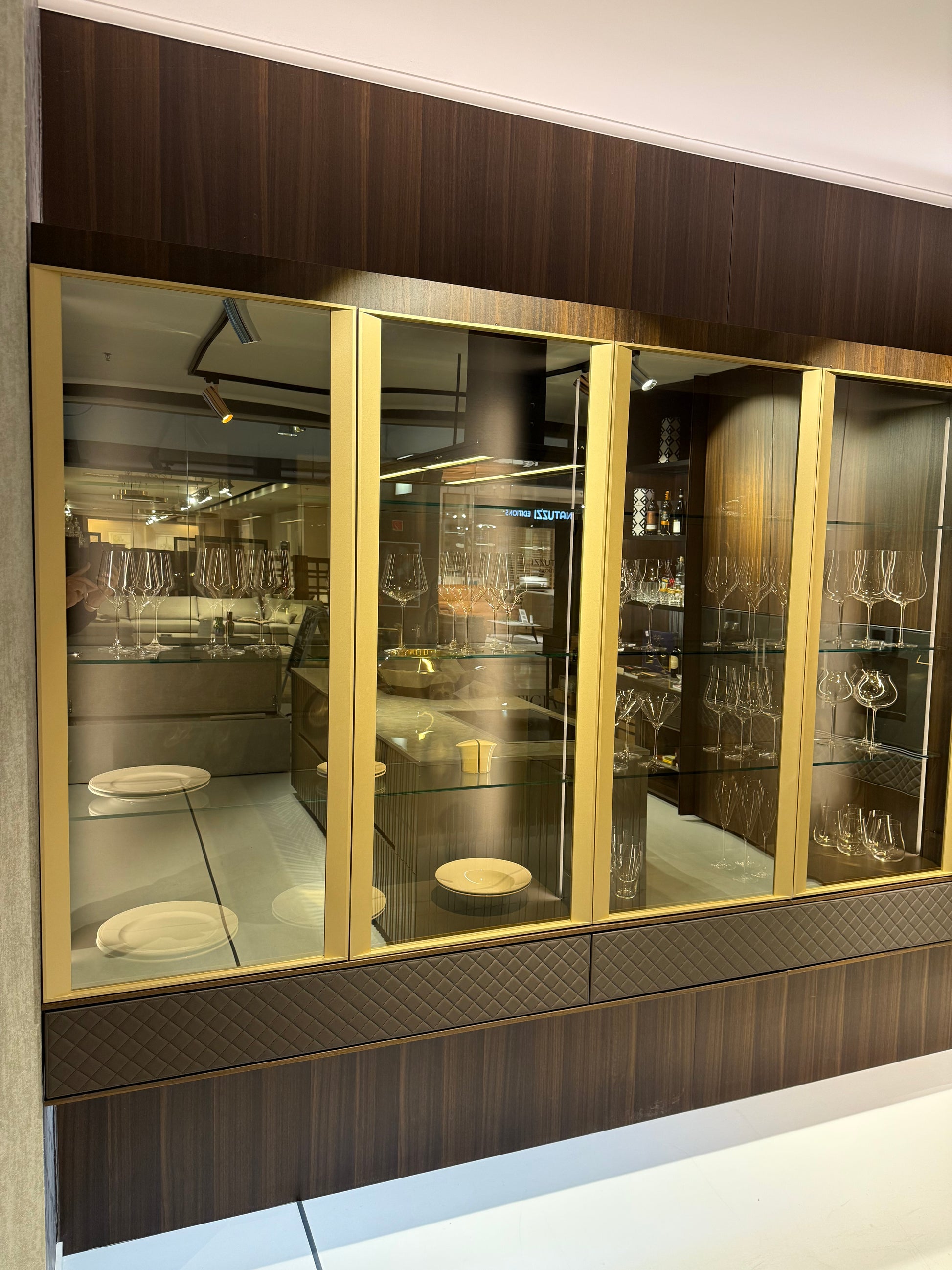 Aster "Pure Glam" Konyha a luxus teteje a csúcskategória megtestesítője. Az Aster gyár Olaszországban pontosabban "Pesaro" városában található - Pavarotti villájához közel. Méltán híres és közkedvelt manufaktúra egyedi konyhái hihetetlen minőséget és luxust képviselnek. A Pure Glam és "textúrái" a fény és az árnyékok útjáról mesélnek. A felületek elnyelnek minden visszaverődést, és visszaadják az anyag eleganciáját. "Gaggenau konyhagépekkel felszerelt, Falmec elszívóval, EUKALIPTUSZ FURNÉROZOTT, Dekton technikai köves munkapult, MOTORIZÁLT azaz "Blum Servo Drive" elektromos működtetési rendszerrel, belső világítással, csúszásgátlós fiók belsők, amerikai dió fiók kávák, nubuk bőrrel borított steppelt fiókok, kihúzható ajtók, szivar humidor és bárszekrény, vitrin LEDdel, alumínium keretek vitrinnél tükör reflexes füst üvegesek és aluminium metál fényezésű aranykerettel, kapszula tartó, magas fényű festett sziget front. Méret : Vitrines rész: 360 magas cm X 167 széles cm, Nagy hosszabb oldali rész bár résszel együtt: 285cm magas X 442cm széles, Sziget: 305cm széles x 102 cm mély.