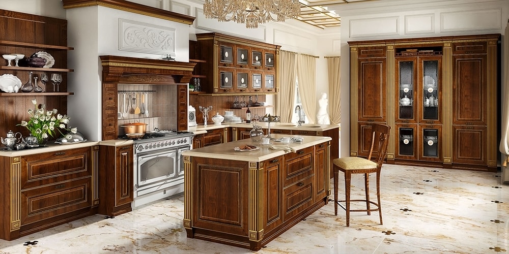 Imperial olasz luxus konyha, rendkívül elegáns karakteres és a klasszikus kialakítású modell, kiemelve az ajtók és fogantyúk arany / ezüst bevonatával. Made in Italy design. A klasszicista stílus minden moduláris elemben megtalálható, hagyományos megjelenésűek, miközben a modern kényelmet szolgálja. Finom egyedi frontokat mutat be a fehér ezüst, fehér arany, arany dió, kék ezüst, ezüst rózsa, ezüst kréta, ezüst fekete színben.