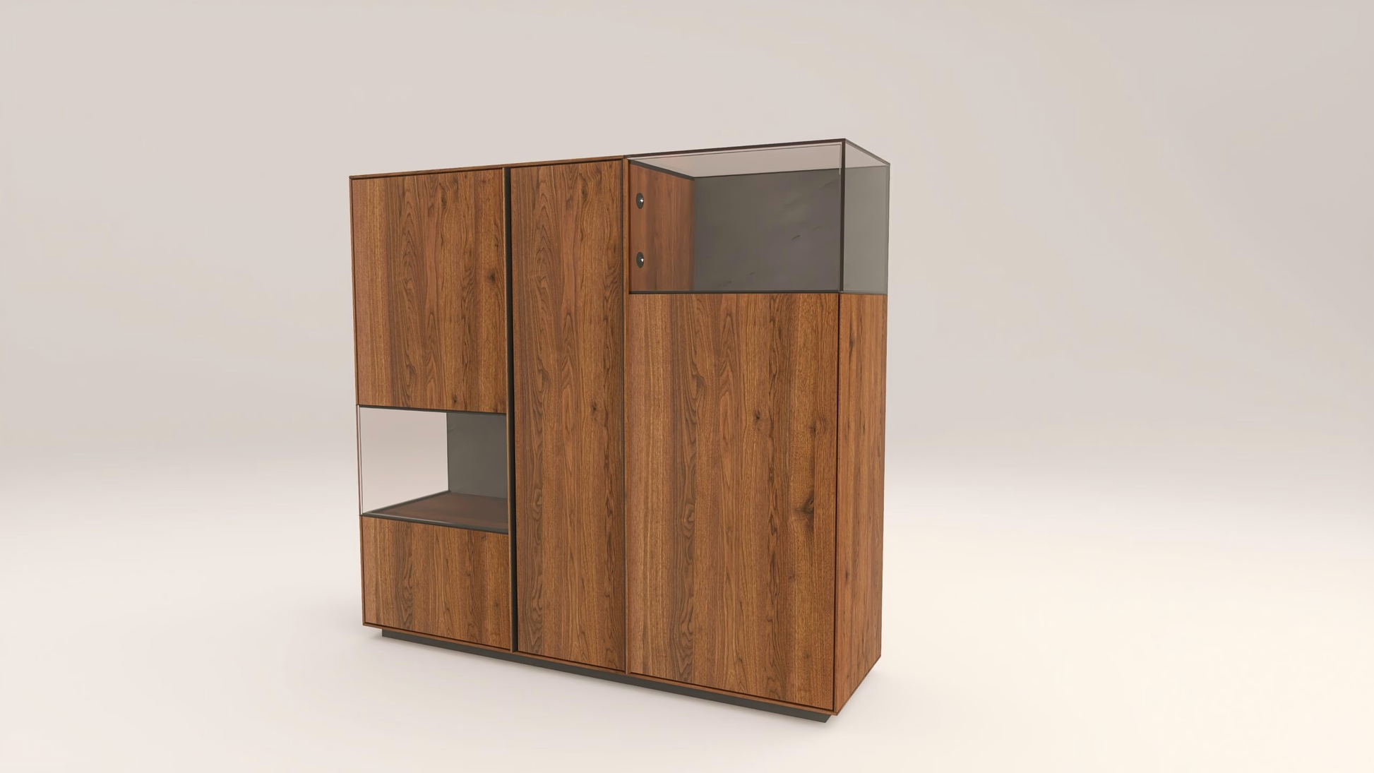 Tömörfa szekrény, két üveges ajtóval és egy fa ajtóval mögötte polccal. A hátfal anyaga ( pala, kerámia) és a világítás opcióként választható.