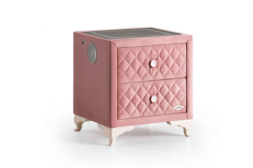 45 cm X 52 cm. Pinky okos éjjeliszekrény textil bevonattal.Az okos éjjeliszekrény rendelkezik USB+USBC csatlakozókkal, hangszóróval, LED világítással és vezeték nélküli telefontöltővel.