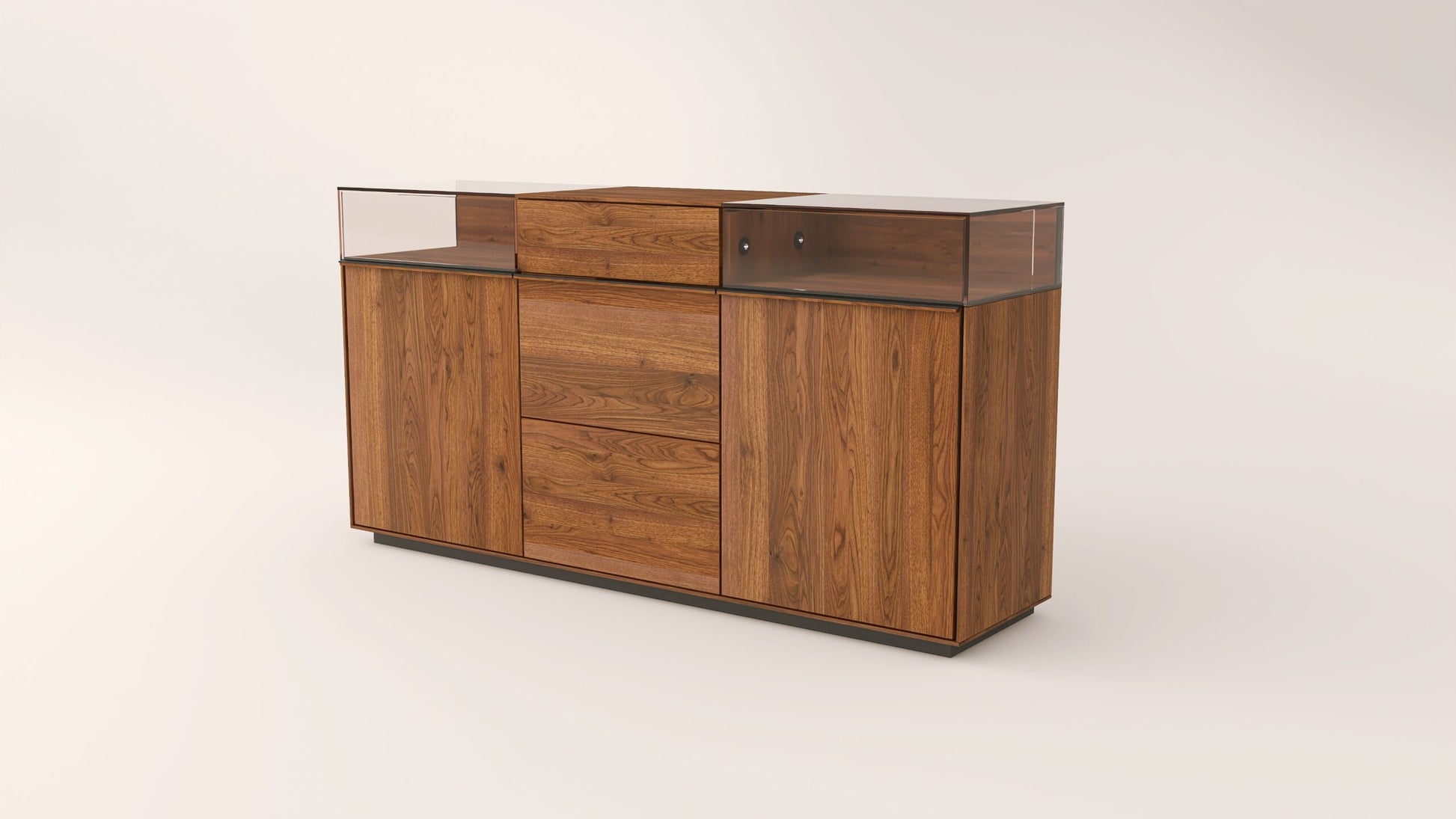 Tömörfa komód két üveges nyíló ajtóval mögötte egy-egy polccal, egy keskeny és két mély fiókkal. A két üveges fa nyíló ajtó frontfelülete szürke kerámiával vagy palafurnérral rendelhető. Az evőeszköztartó, a világítás opcióként választható.
