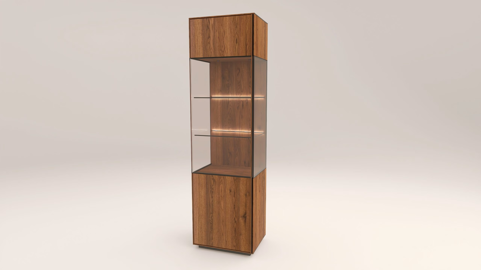Tömörfa vitrin, egy üveges ajtóval mögötte egy fa és két üveg polccal. A hátfal anyaga (kő, kerámia) és a világítás opcióként választható. Rendelhető jobbos és balos kivitelben.